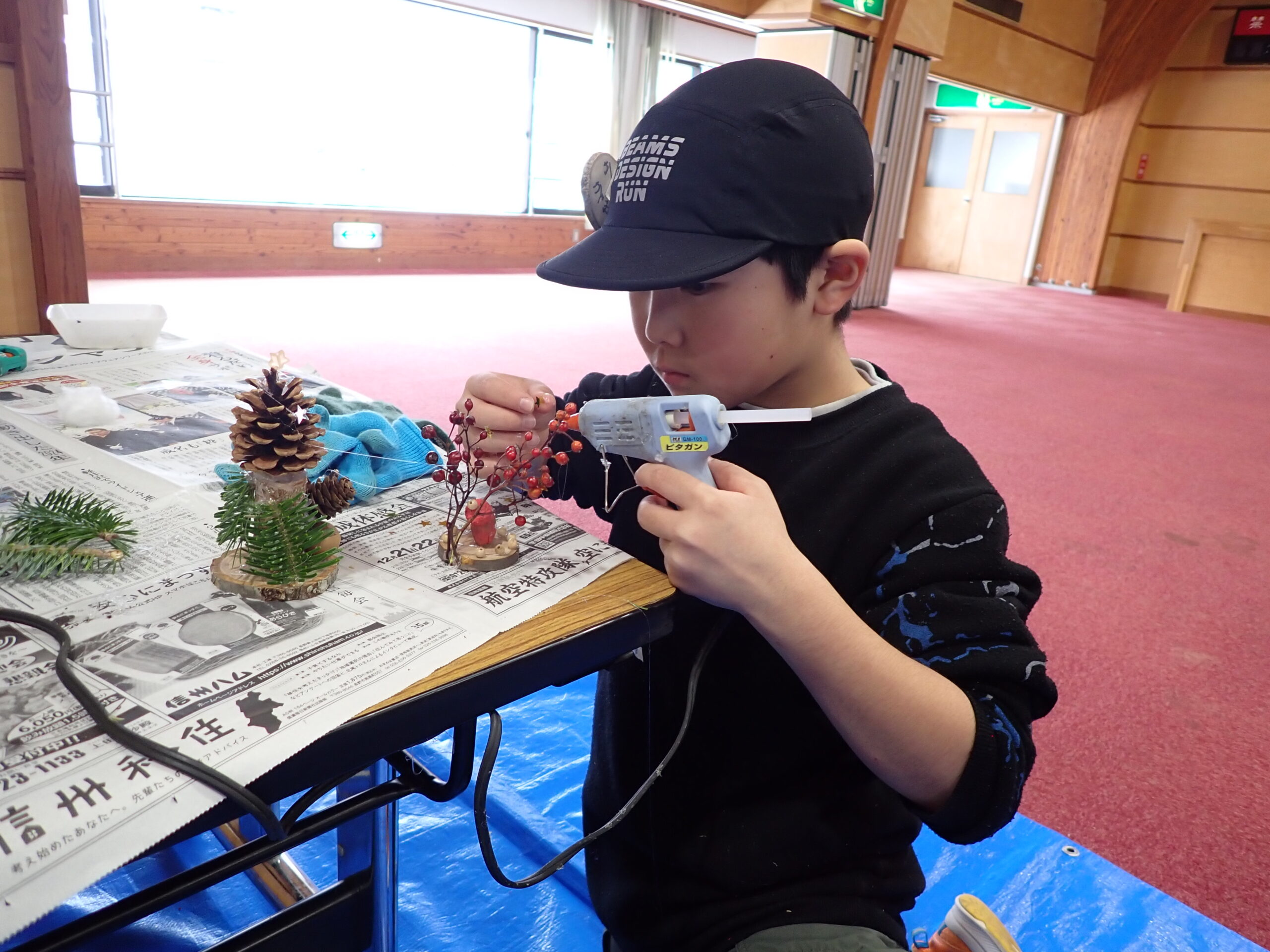 グルーガンで葉っぱやまつぼっくりを立ててくっつけて…