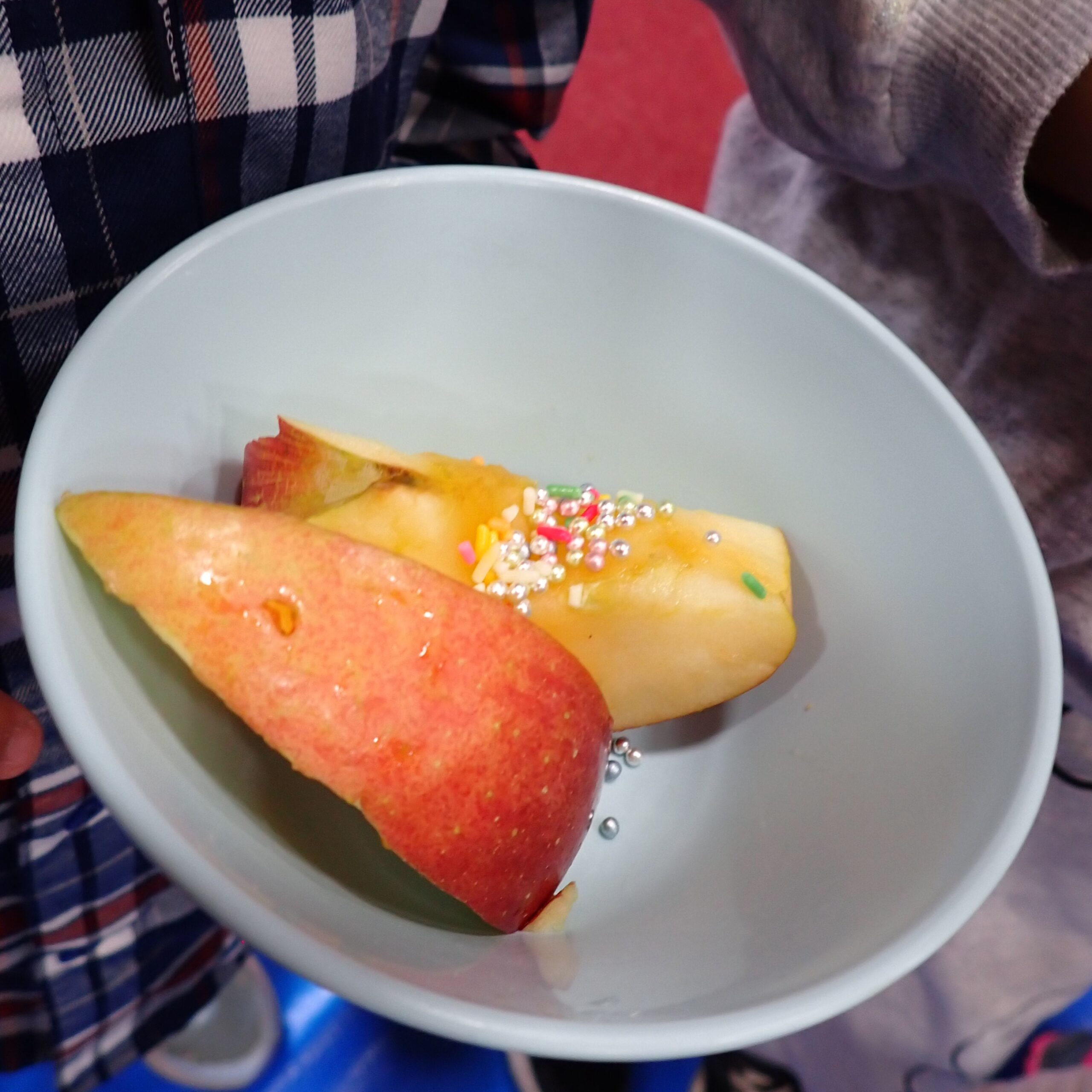 美味しそうなリンゴを持ってきてくれたようです。あとでみんなで食べよう!