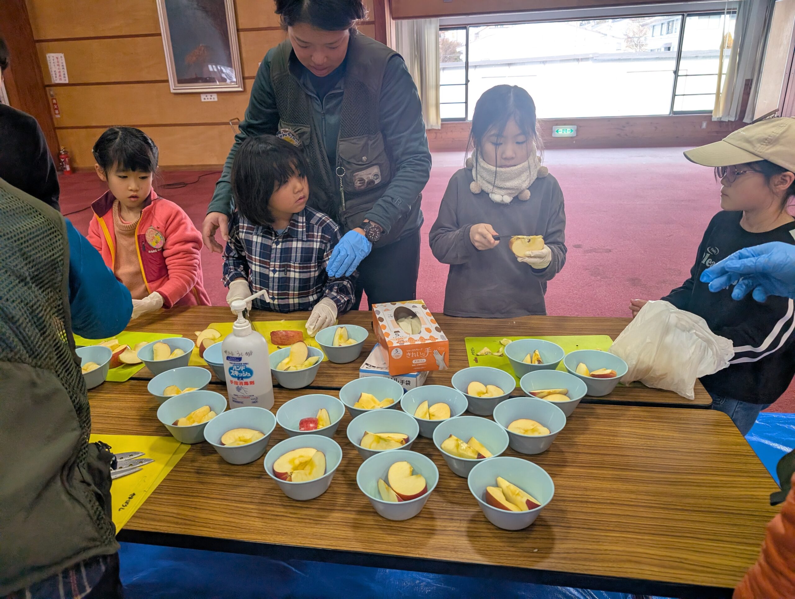 プレゼントのリンゴを切り分けて、みんなの分を用意します。
