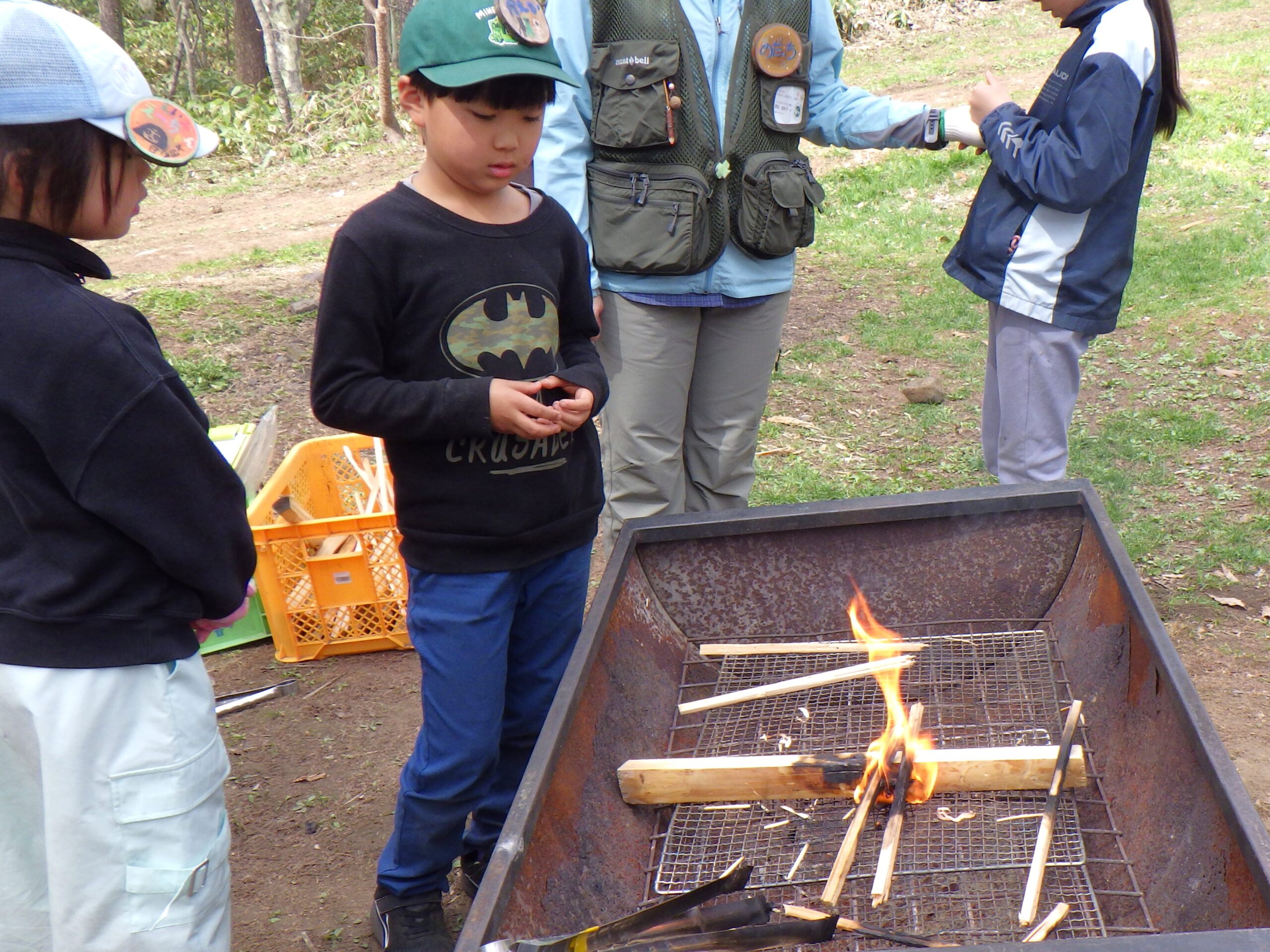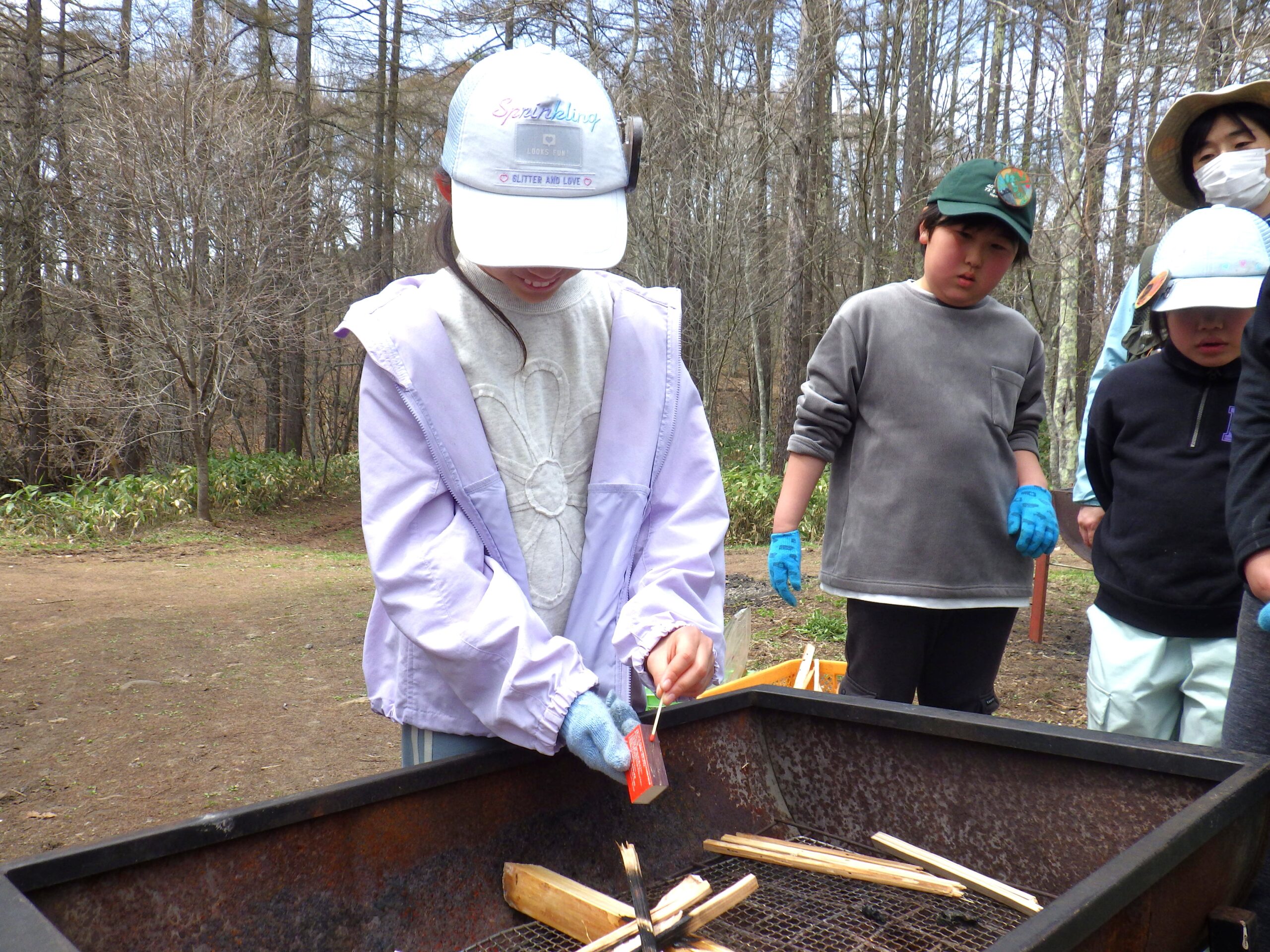 火おこしチームです。ナタで作った小割を上手立てかけて、白樺の皮にマッチで火をつけます!