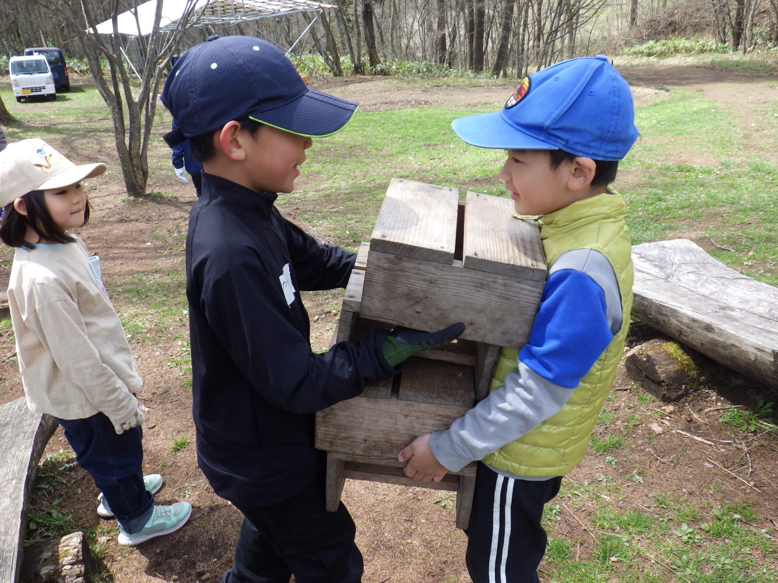 5月の遊び隊は、春の森遊びです。今日挑戦したものを使って一日自由に遊びます。