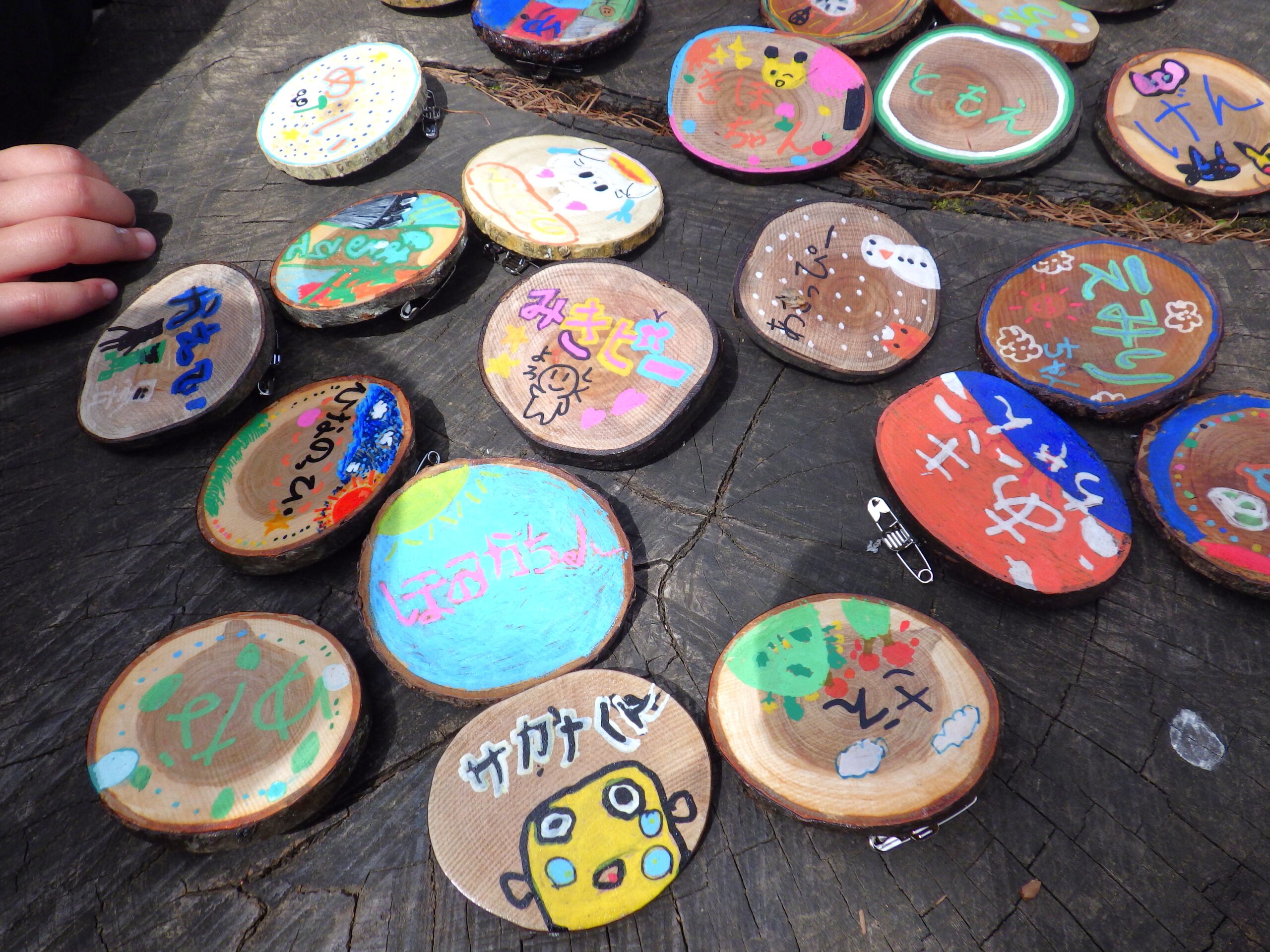 その後は、1年間使うバッジを作り。木の輪切りに読んでもらいたい名前をかきます。