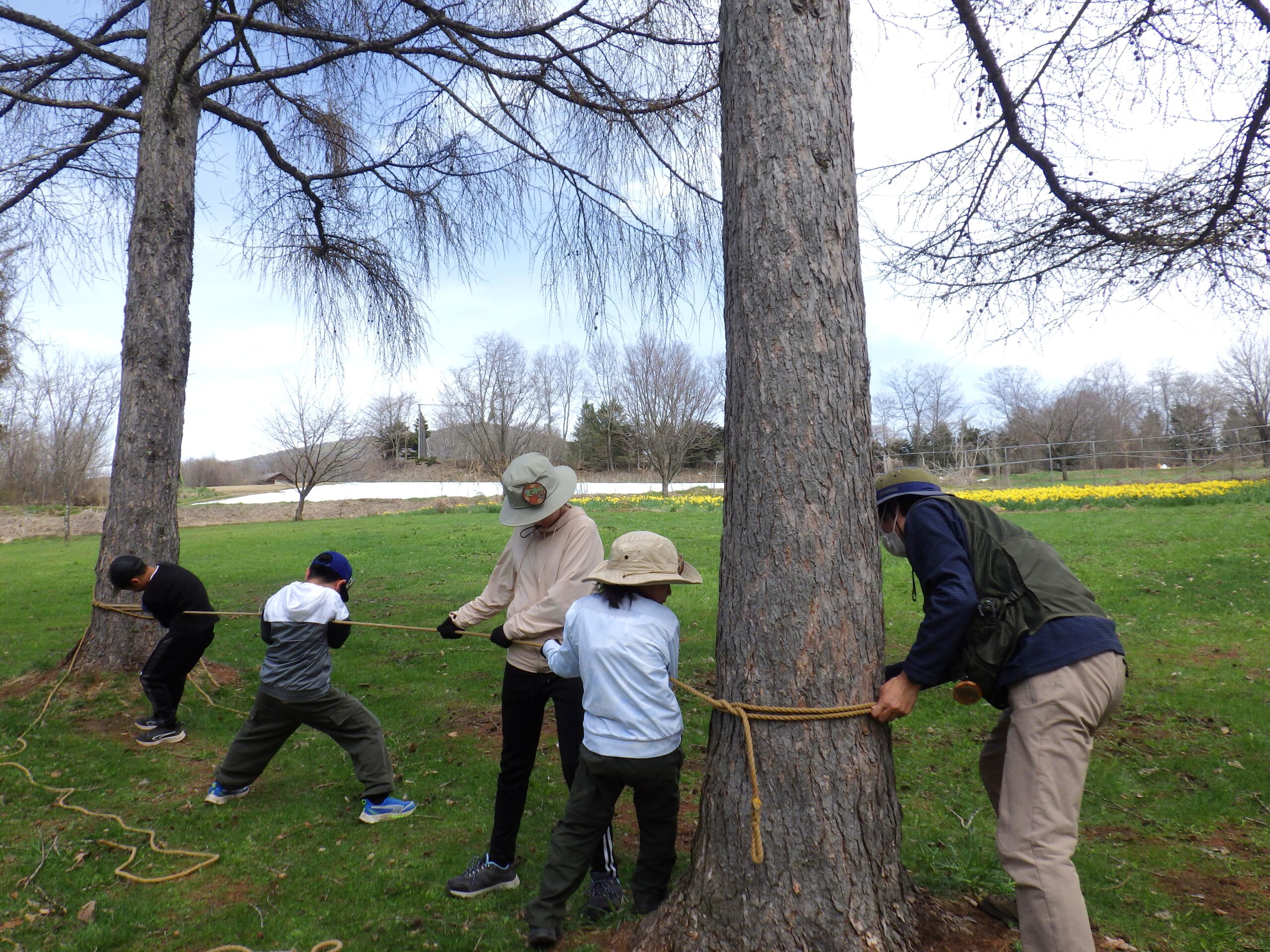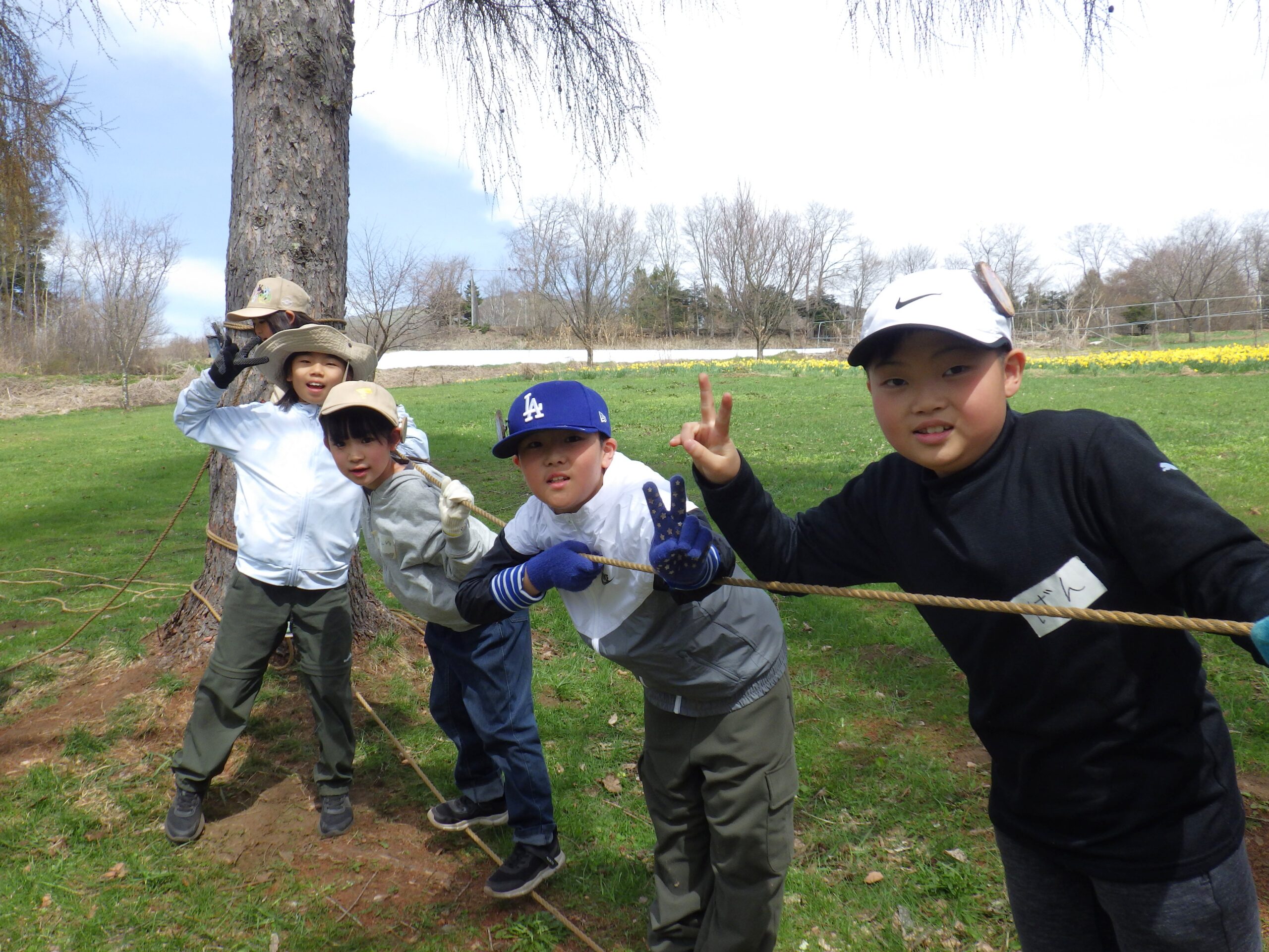 こちらはロープ遊びチームです。「まき結び」を練習して、森の遊具を一緒に作りました。