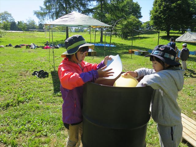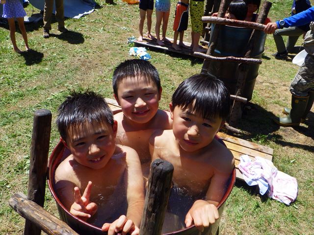 丘の上まで日の出を見に行きました。 1日過ごしたテントをたたんだらドラム缶風呂に入りました。 ドラム缶風呂の設置をしたらみんなで水くみリレー