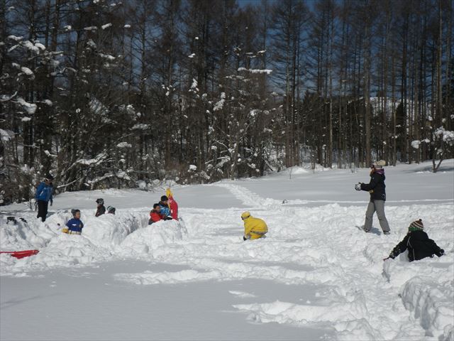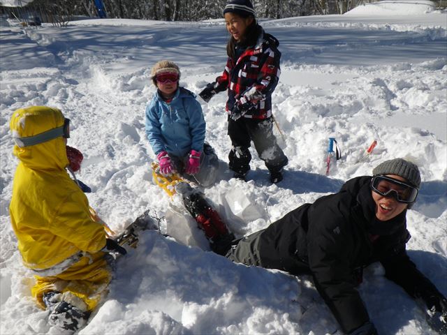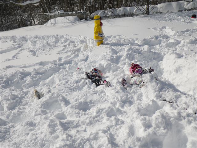 土曜コースは大雪のため開催できませんでしたが、 今日は絶好の雪遊び日和!! 昨日までに降り積もった雪がいっぱい!! 始めの会をしたら雪遊び!! どこまで掘っても地面が見えないぞ そり滑り! 落とし穴に引っかかった! 雪布団… 雪合戦の要塞づくり いざ、雪合戦! 雪の穴トンネルを掘ったよ 青空が広がる中、たっぷりの雪で遊びました。 次回はスノーシューを履いて森の中へ もちろん雪遊びも! 次回も雪の中でたくさん遊ぼう!!