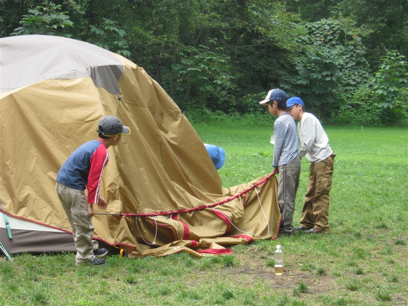 声をかけあいながらテントをたたんだら、早速CMづくりの続きを開始! リーダーを決めてからくじ引きをしたという3チームに分かれて、 あーでもない、こーでもないと製作会議。 川遊びの説明用にブルーシートを使ったり、宿を段ボールで作るチーム、 画用紙に楽しかったことベスト3を書いて発表したチーム、 「木、火、川、虫、友」を人文字でつくって紹介してくれたチームもありました。 みんなが集まるといろいろなアイディアがでること、 1人1人の活躍が、合わさるとすごい力になることを再確認した4日間でした。 このメンバーでキャンプができて、本当に楽しかったです。 今頃、お土産のジャガイモはどんな夕食に変身しているでしょうか。 また一緒に菅平で思い切り遊びましょ。