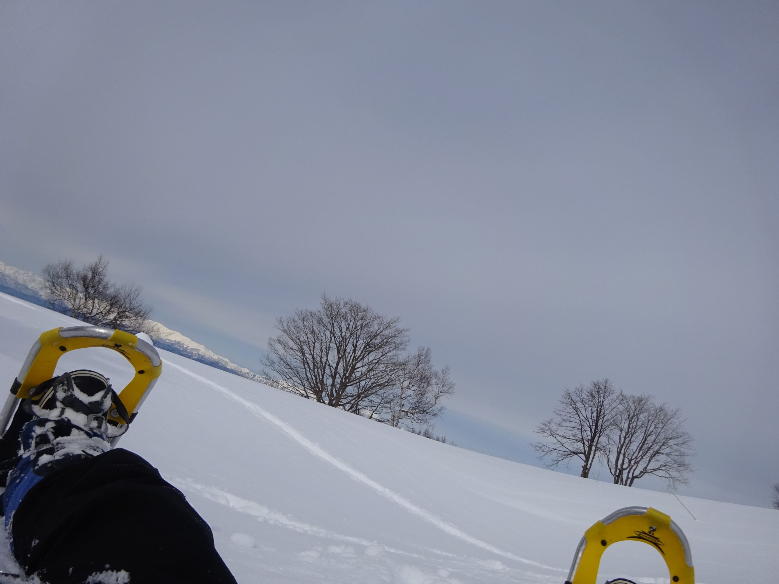 曇り空ながら、北アルプスも見えそうなのでここからスノーシューでゆっくりと上へ。
