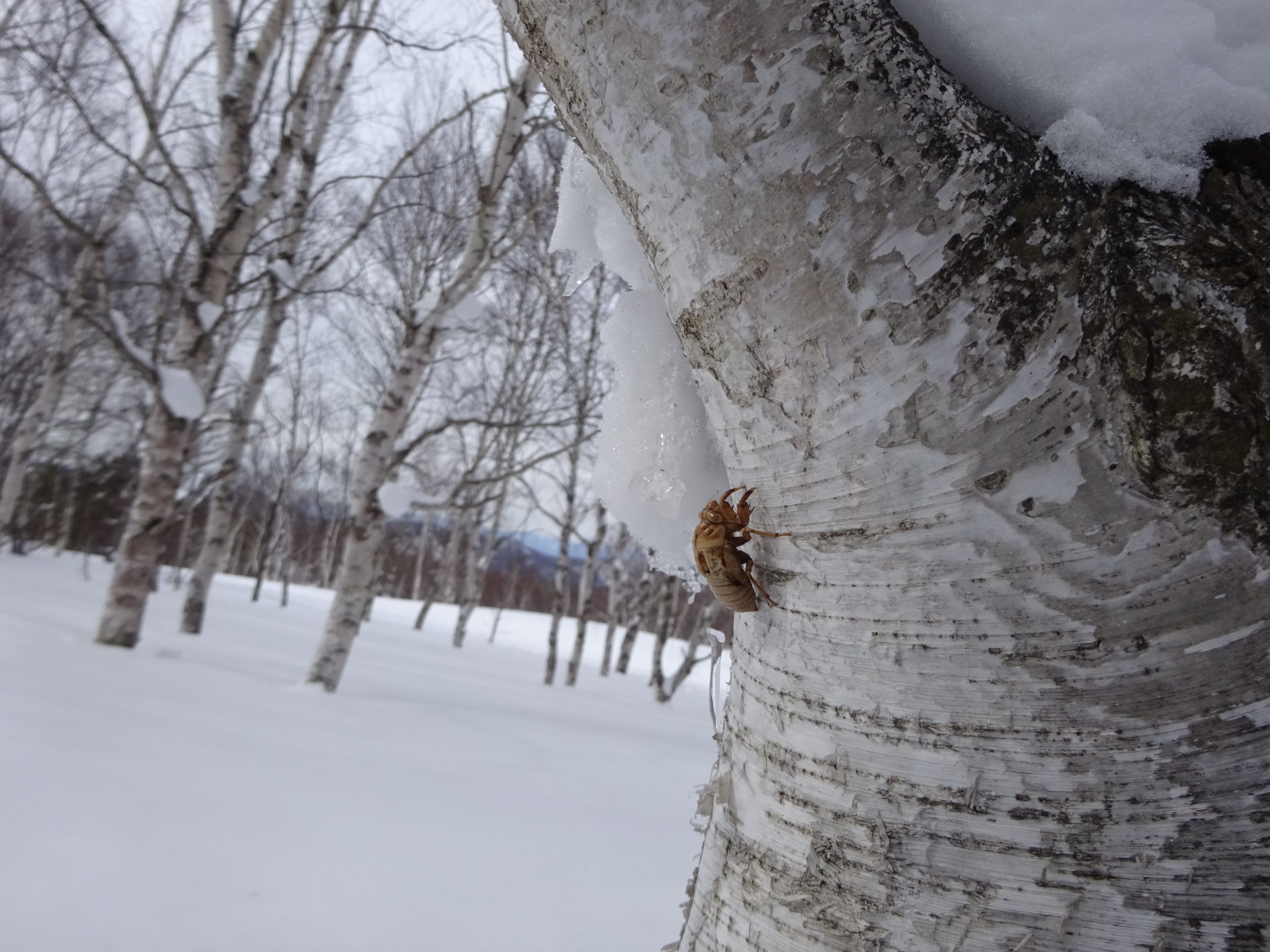 季節外れのセミの抜け殻。風雪に耐えてしっかりとくっ付いていました。