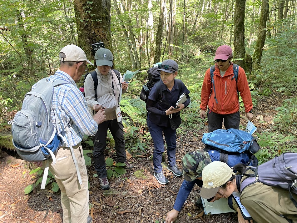 初日は木曽郡木祖村の水木沢天然林を訪れ、今回案内をしてくださった湯川さんから木曽五木を教わるところから一日がスタート。