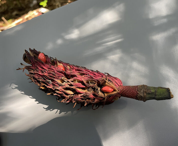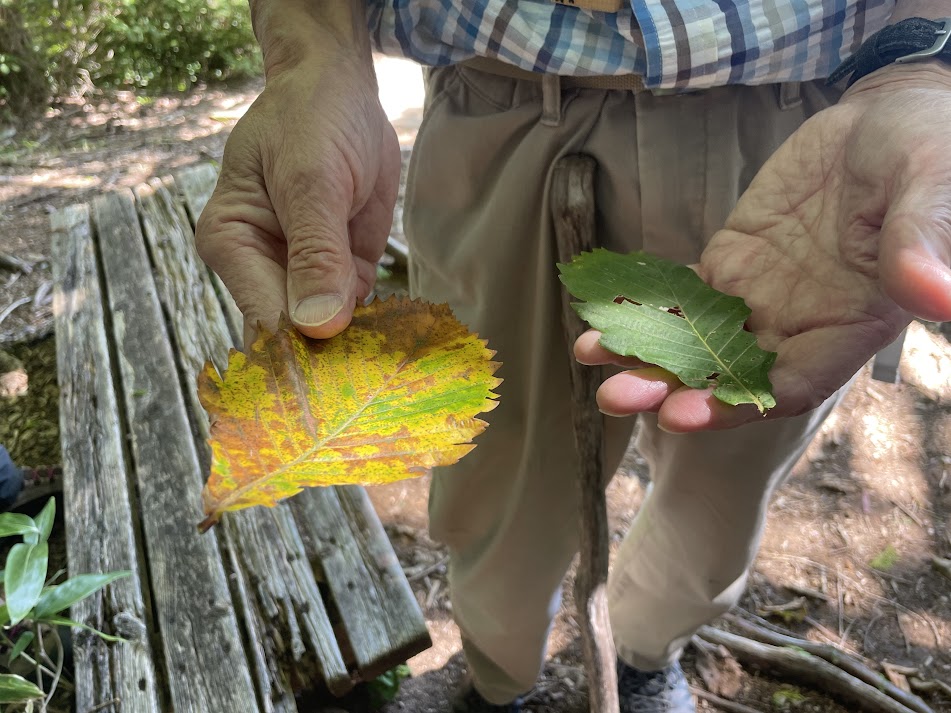 写真は、湯川さんがわざわざ持参してくださったホオノキの赤い実と休憩地点に落ちていたミズナラとコナラの葉っぱ。水木沢天然林のことはもちろんのこと、自然の面白さや不思議を最初から最後まで丁寧に楽しく教えてくださいました。