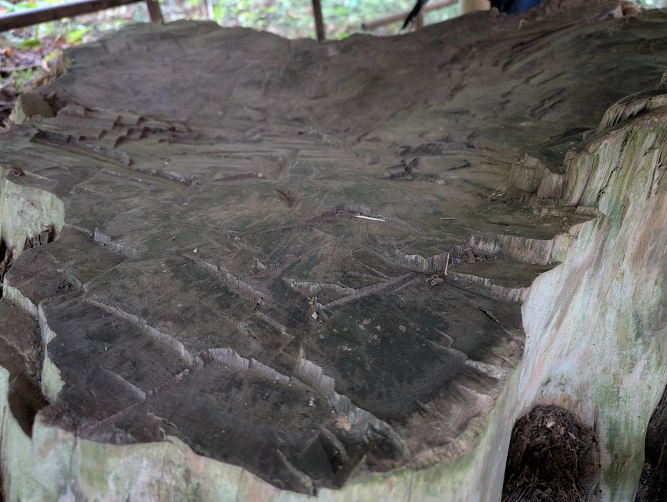 切り出す際には三方向から斧を入れ伐り込んでいく三つ紐切りという方法が用いられ、切り株の表面には実際に斧で切り出された際の痕跡が。なんだかずしんと感じるものがありました。