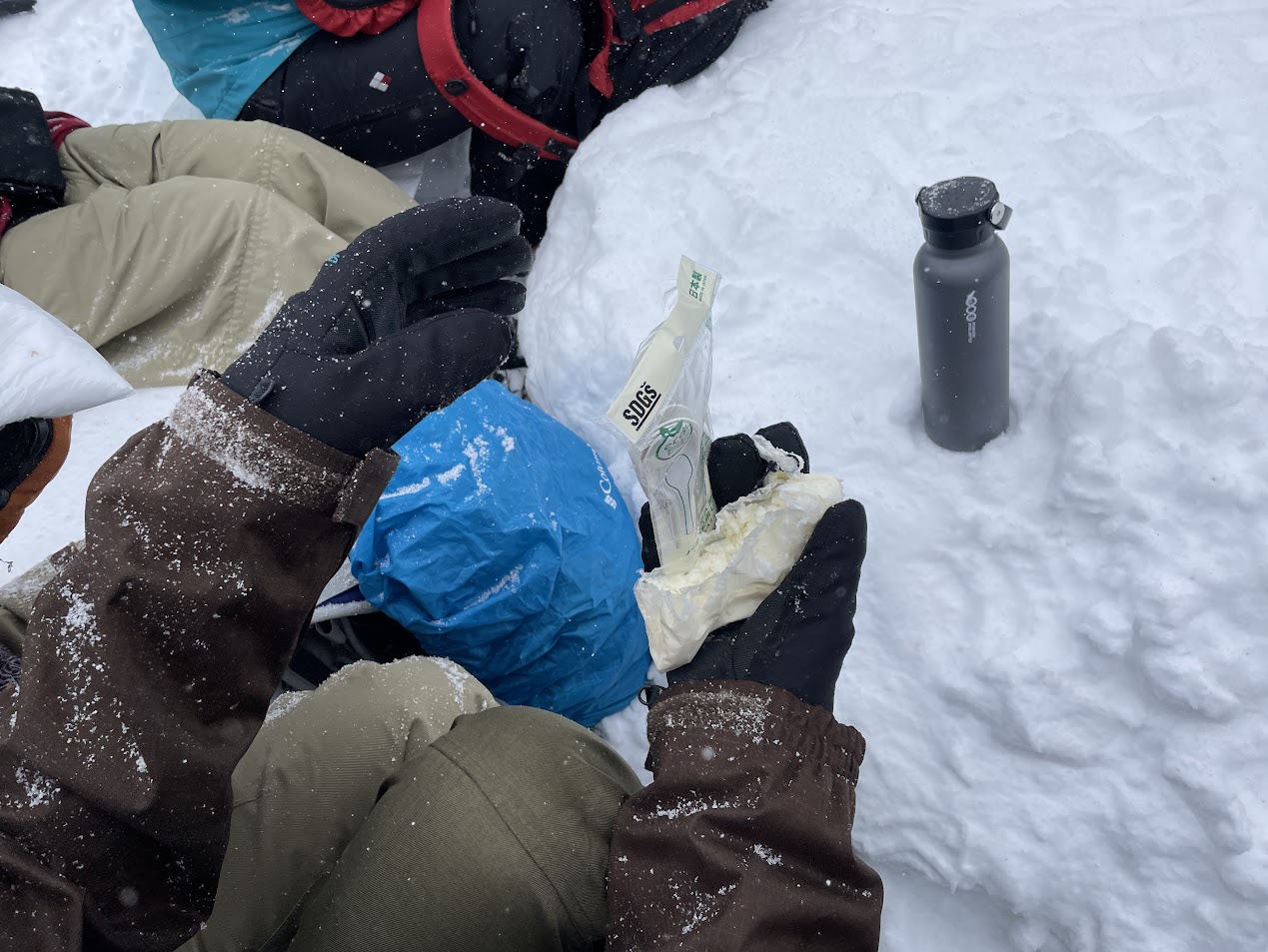 昼食場所ではスノーテーブルを作り、テーブルを囲んでの昼食。
