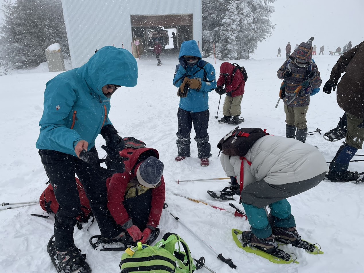 前日から降り続く雪の中、スノーシューの履き方や歩き方をレクチャーするところからスタート。