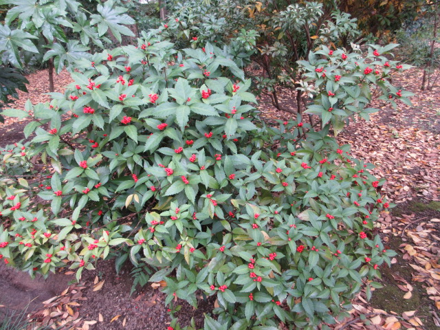 ③ センリョウも鮮やかな赤い実をたくさんつけています。