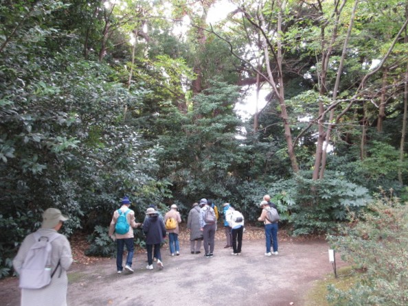 ⑥ 脇道に逸れて樹木を観察します。庭園の周囲はたくさんの高木で囲まれています。