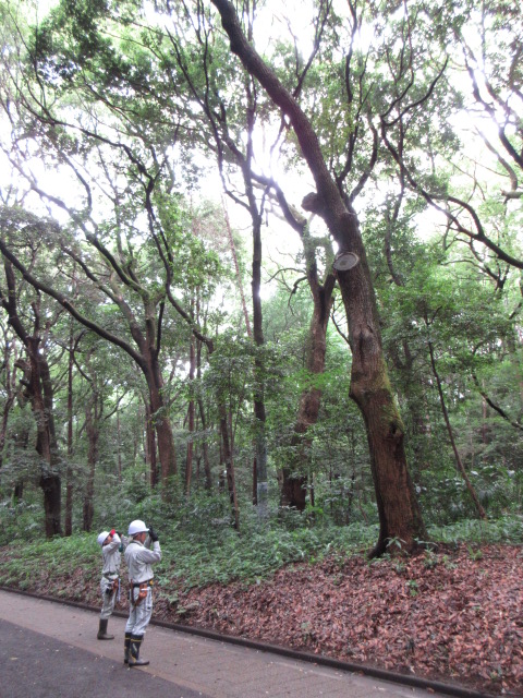 ③双眼鏡で頭上を見上げ樹木点検中のようです