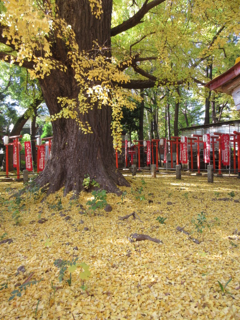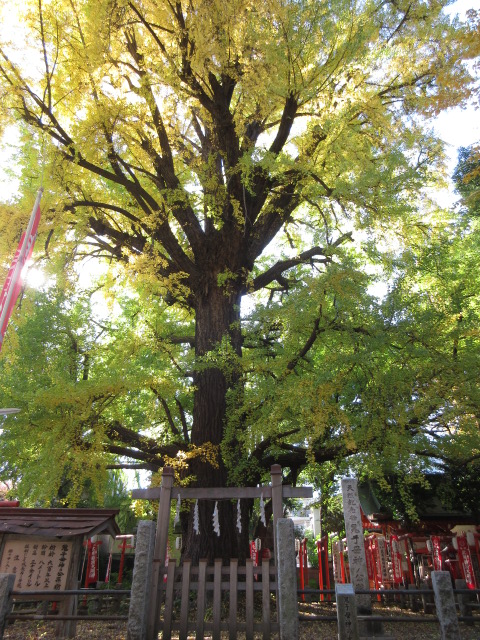 ④ 境内にはケヤキを見下ろすほど一層高くそびえたつイチョウの巨木が。