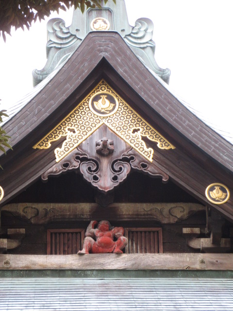 ⑦ 邪鬼彫物のある千鳥破風。柘榴をかたどった紋章も見えます。