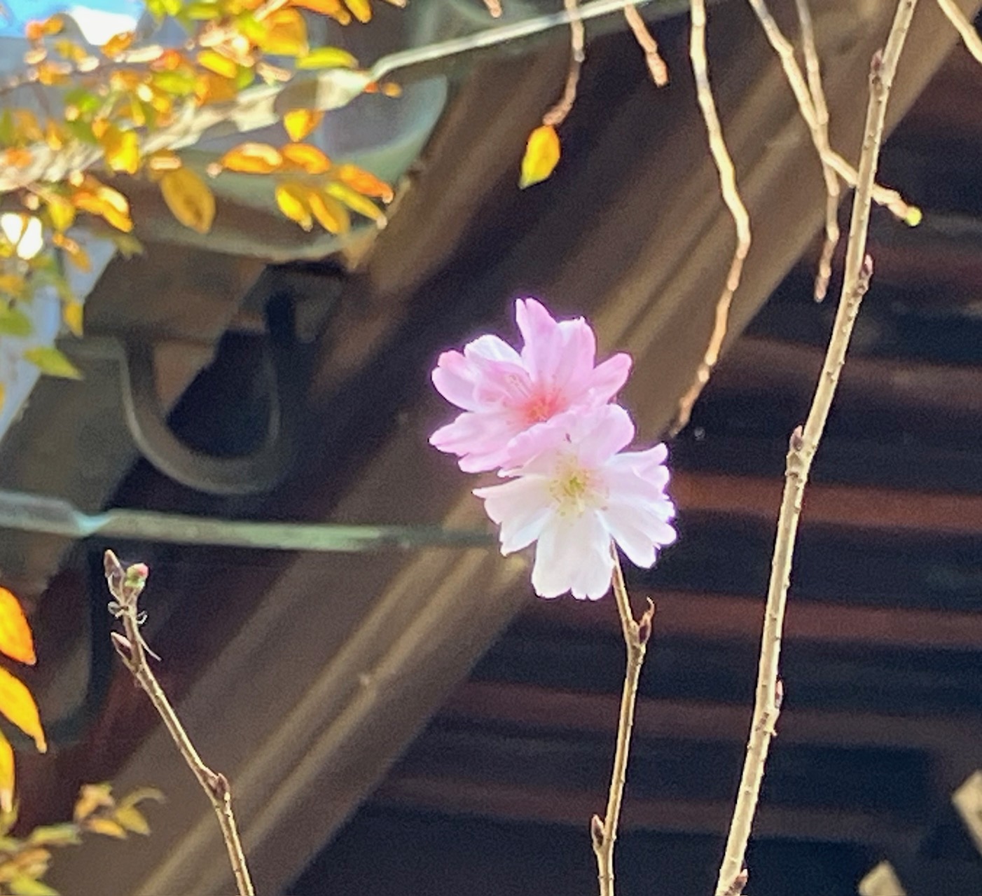 ⑩ 本堂の前にはジュウガツザクラ(十月桜)がほころんでいました。