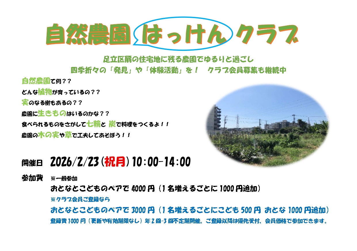 2026年2月23日(祝月)に開催予定の自然農園はっけんクラブに参加してくださる方を募集いたします!(ただ今、クラブ会員も募集中!)