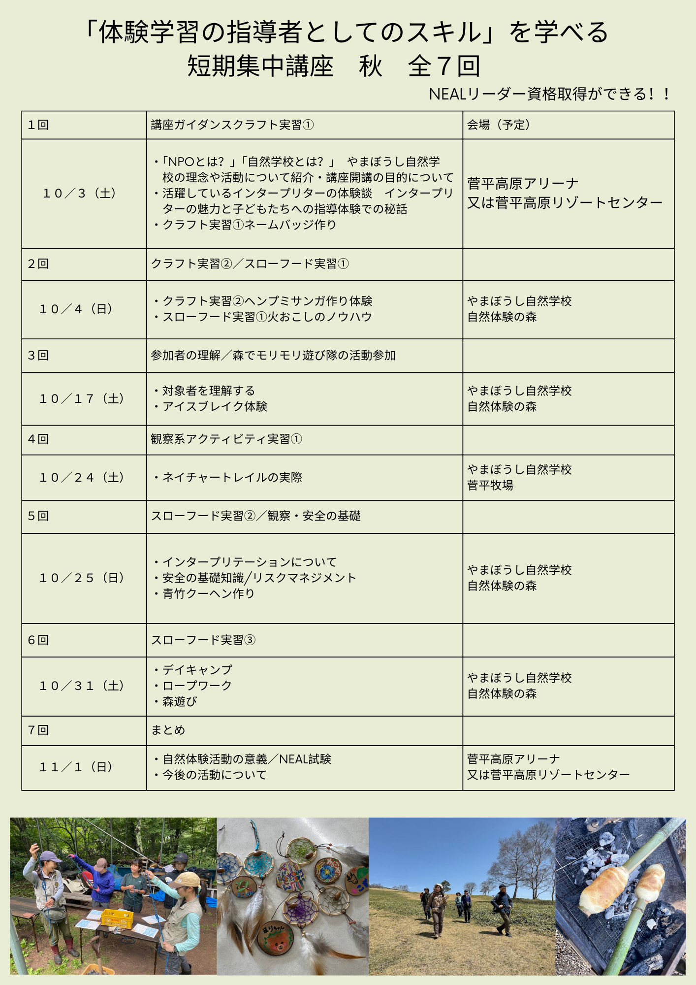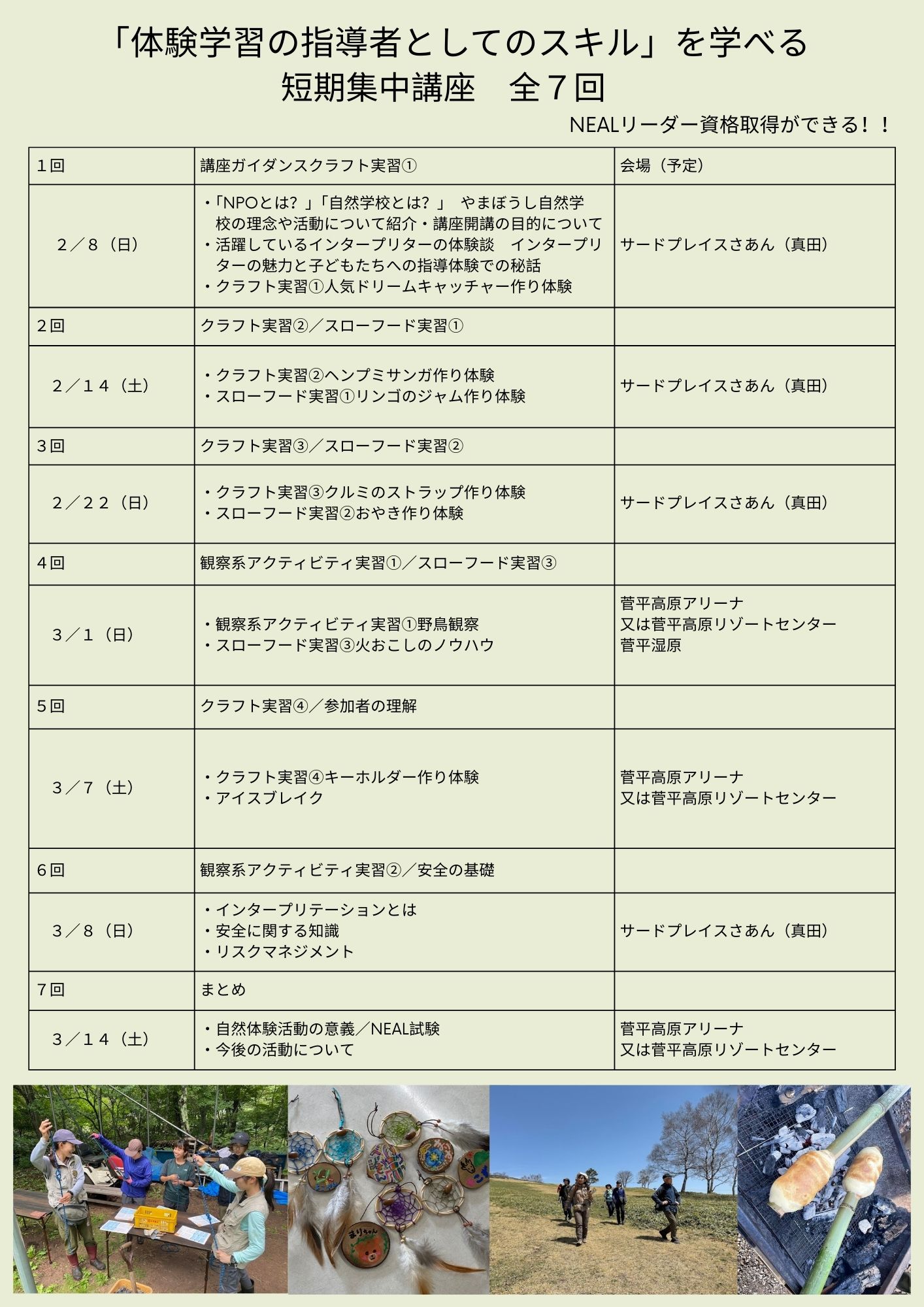 やまぼうし自然学校インタープリターとしての活動や、地域での森林ボランティア活動等に繋げるため、短期集中で即戦力スキルを身に付ける全7回コースです。