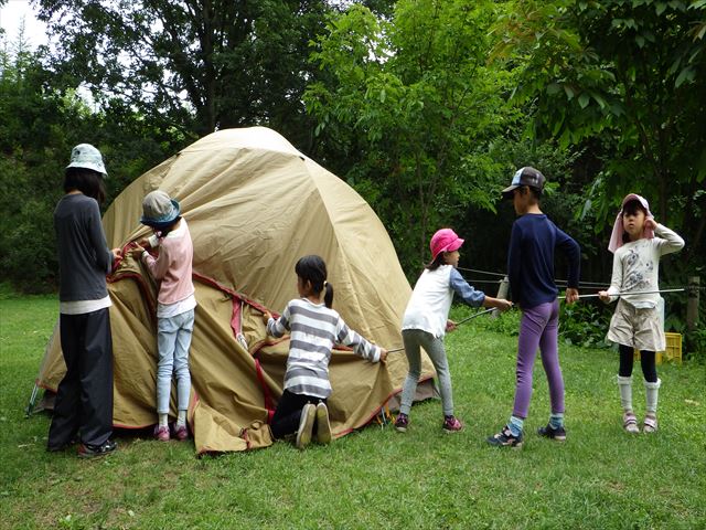 泥んこになって遊んだら、今日泊まるためにテント立て