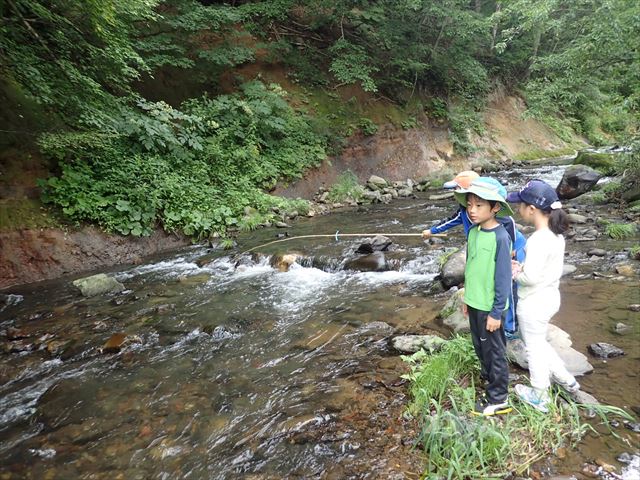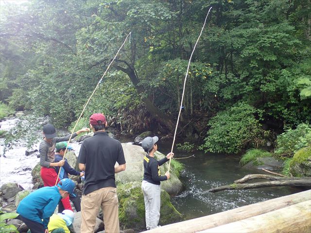川に着いたら釣り名人から釣り方を教わり、渓流釣り。