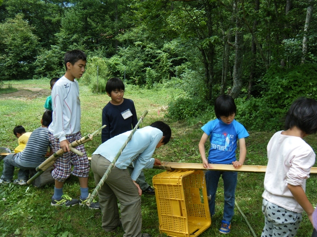 腹ごしらえの後は、さて、何して遊ぼうか? 「沢遊び!」「何か作りたい!」「ちょっと休憩~」 原人たちのペースで時間が過ぎていきます。 沢遊びでは初日にやりたいと言っていた 「飛び込み」をやっては大笑い。 びしょびしょになっても何度もジャ~ンプ! 工作隊はのこぎりやキリ、麻ひもなどを使って バズーカ砲や水鉄砲、竹コップなど素敵な作品がいっぱいできました。