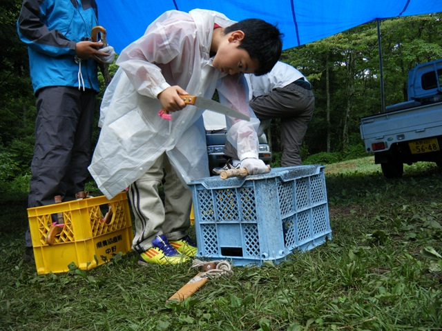 最後のご飯づくりも、原人たちは火を熾し、お湯を沸かし、 お米を炊いて、野菜を切って・・・手慣れた様子でどんどん進みました。 雨が止むと、すかさず手づくりの竹剣で遊んだり、 少林寺拳法をしたり、まったりお話したり。