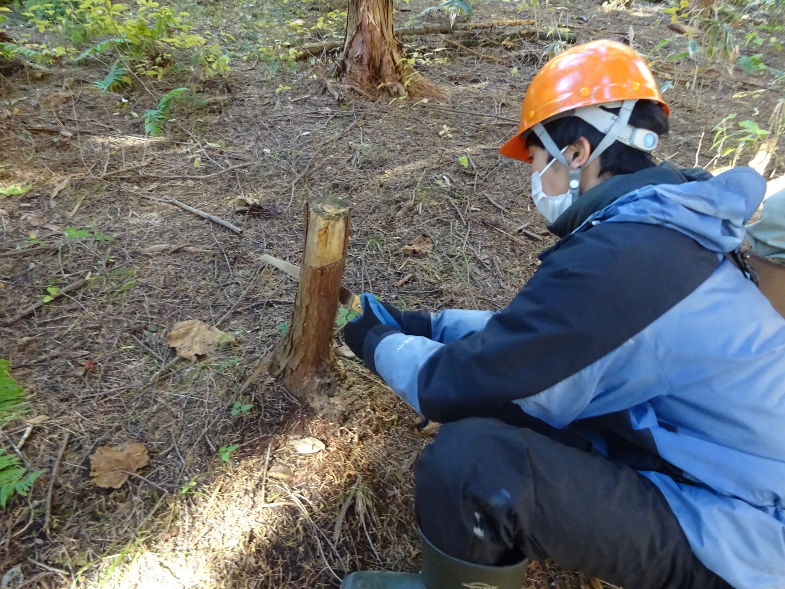 整備体験(間伐体験)を通して、再生可能な資源としての森について学ぶ。