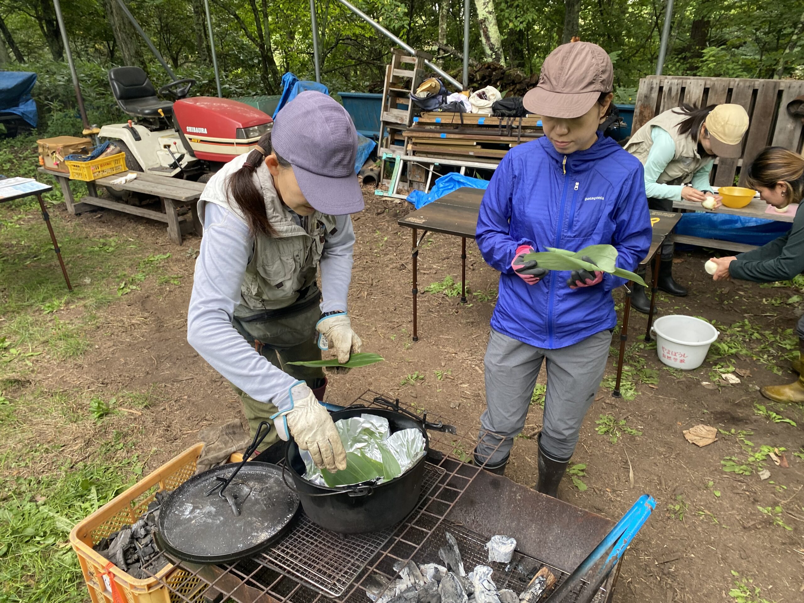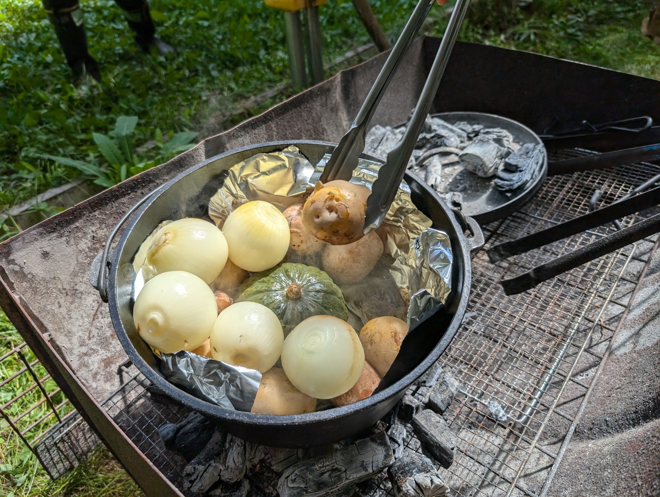 今回は森遊びやデイキャンプで役立つロープワークと前回の火おこしの復習とダッチオーブンで焼き野菜を実施しました。