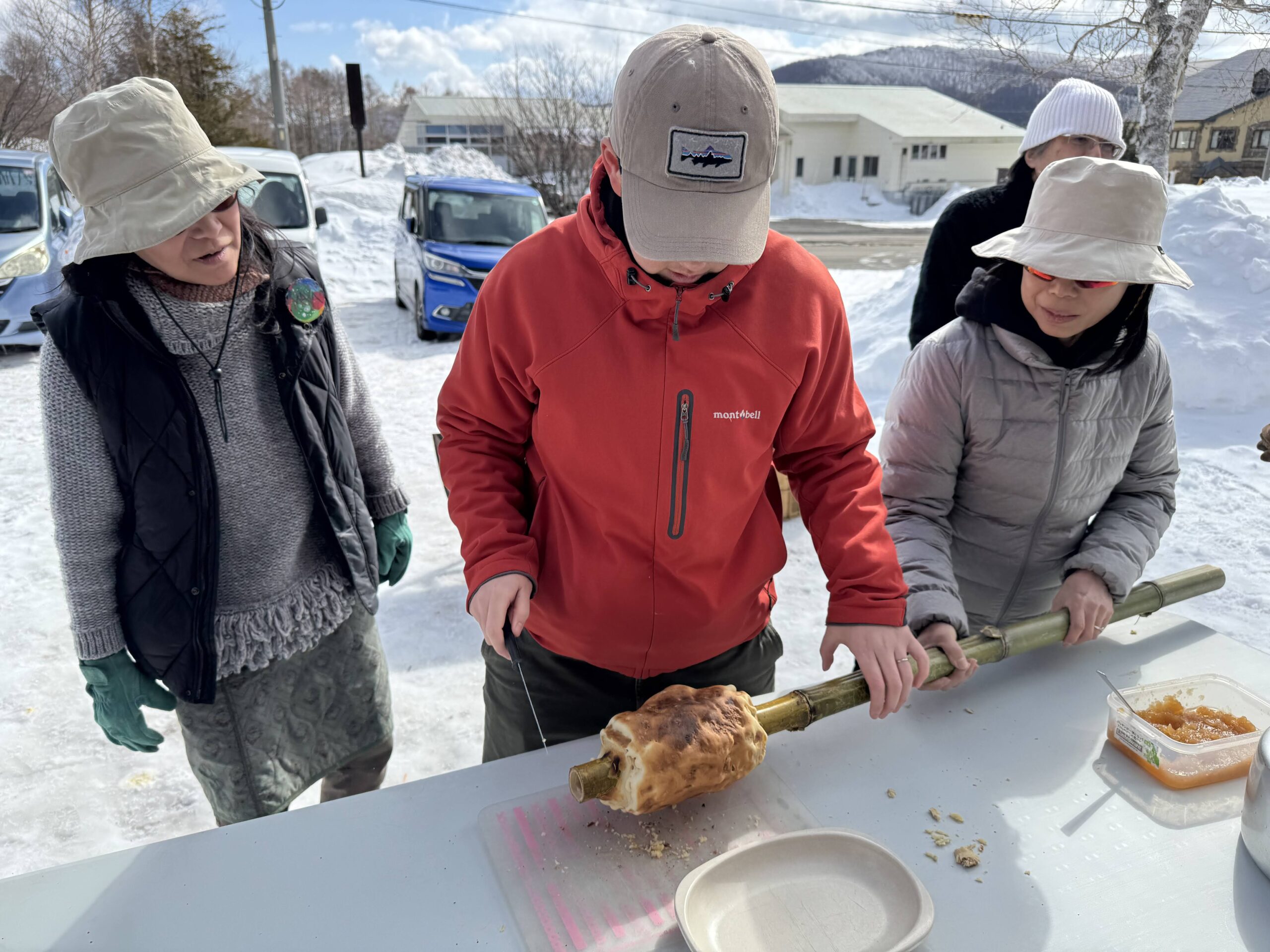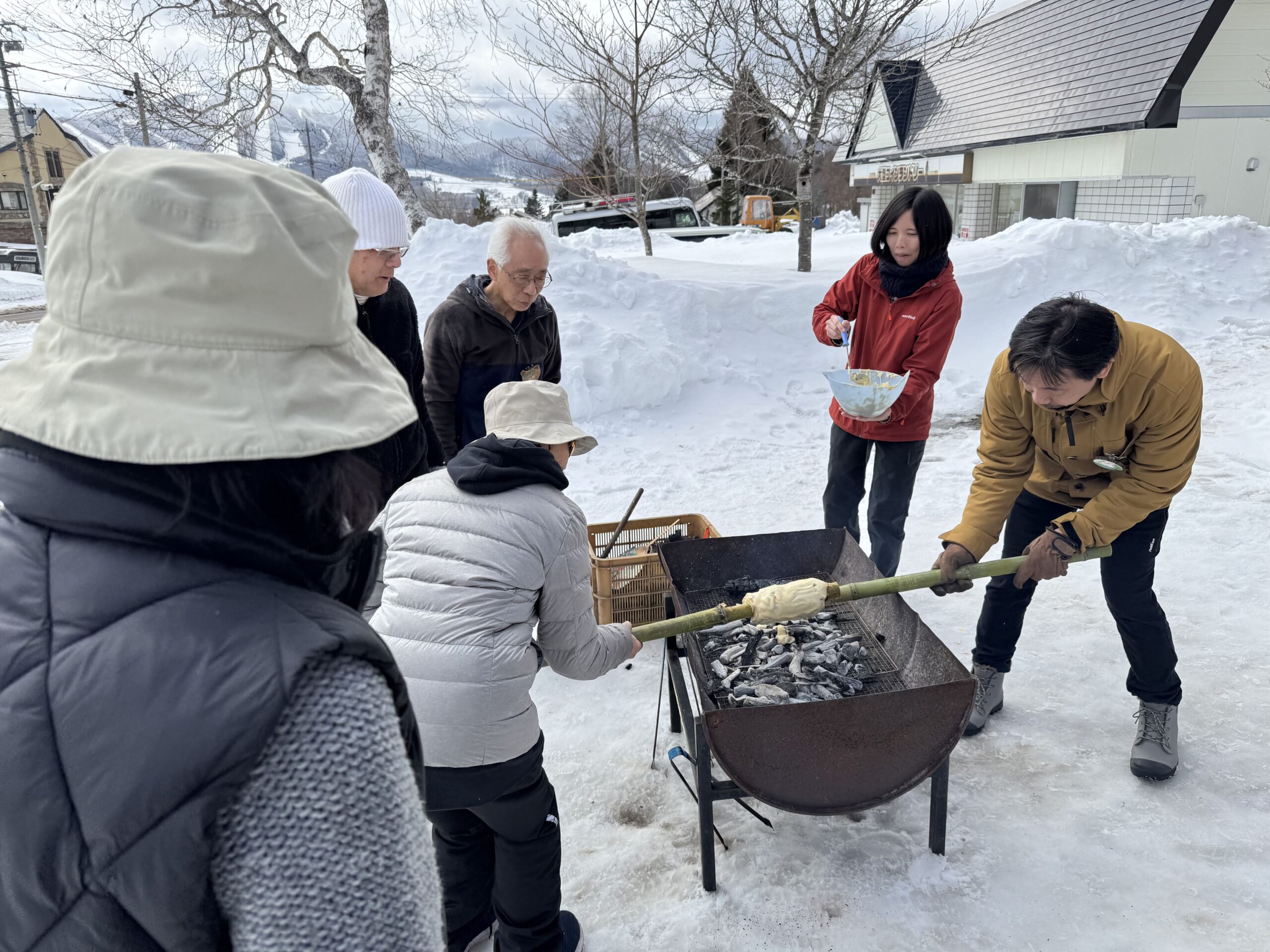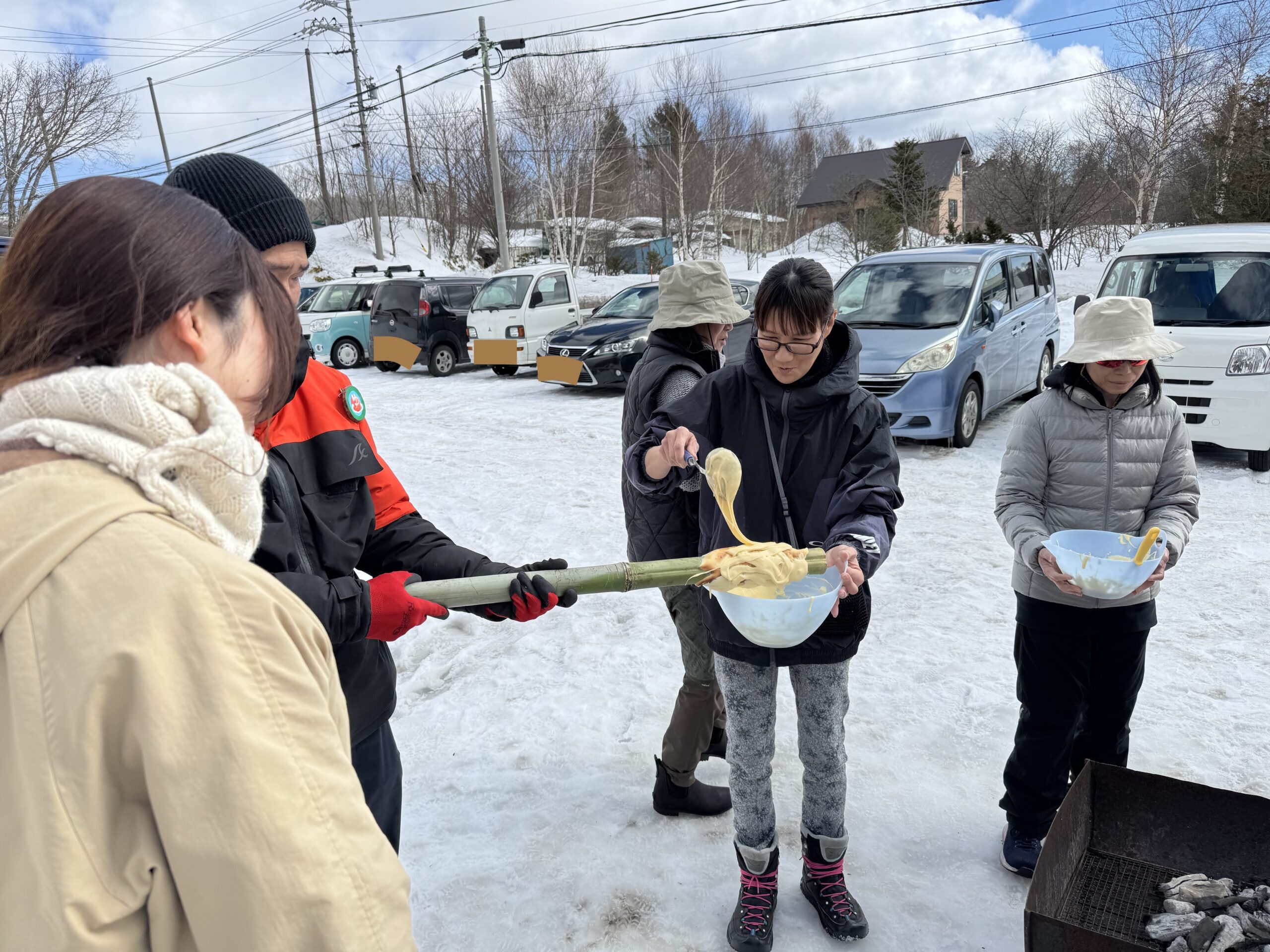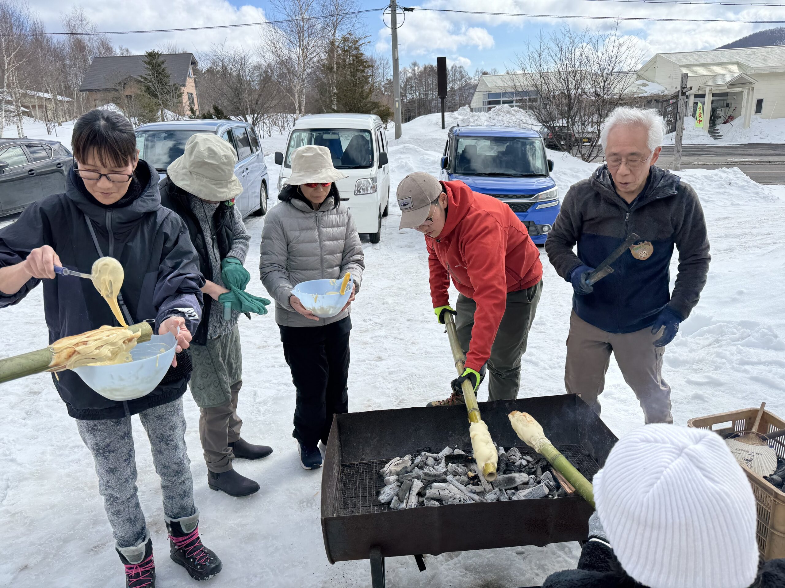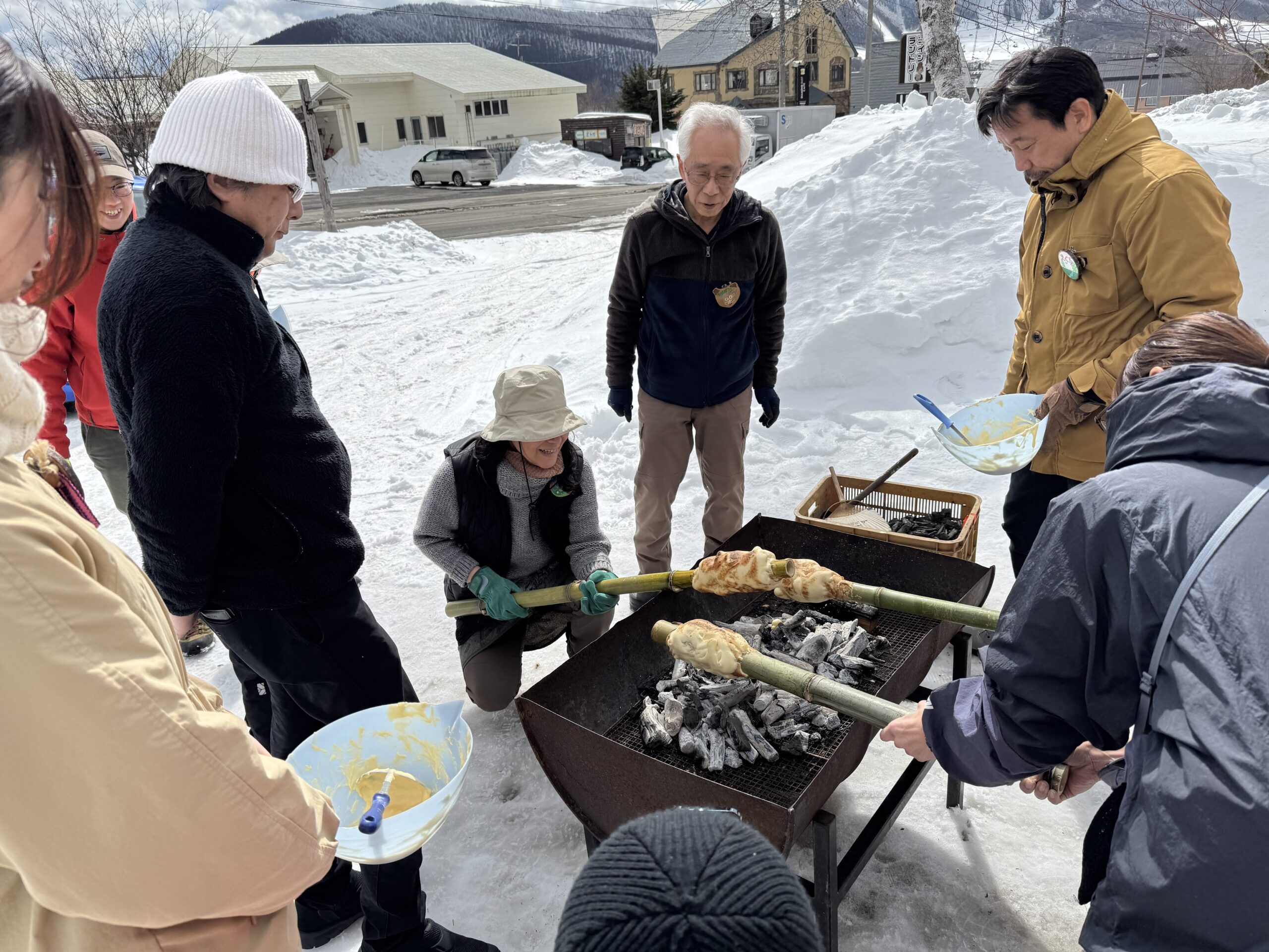 お昼を挟んでスローフード実習②では前回の実習で学んだ火おこしを使った「青竹クーヘン作り」。