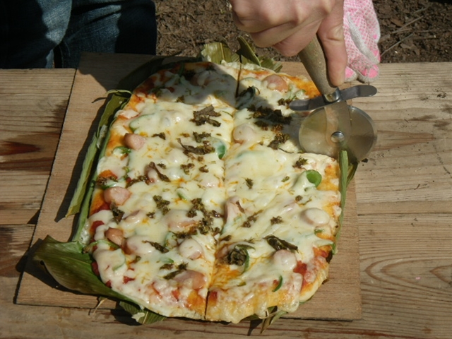 木の輪切りを使ったネームバッジ作りと窯ピザ作りをとおして